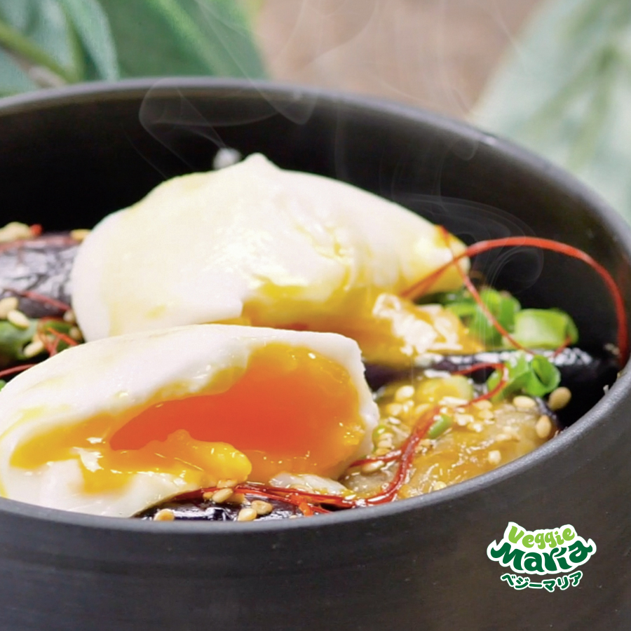 おうちランチにぴったりな揚げナスを使ったどんぶりです。甘辛いタレに絡めた揚げナスと温泉卵とご飯との相性が抜群で箸がすすむ美味しさですよ。ベジーマリアの揚げナスを使うと揚げる手間が省けるので、食べたい時にさっと作れるのが嬉しいですね。(材料2人分)